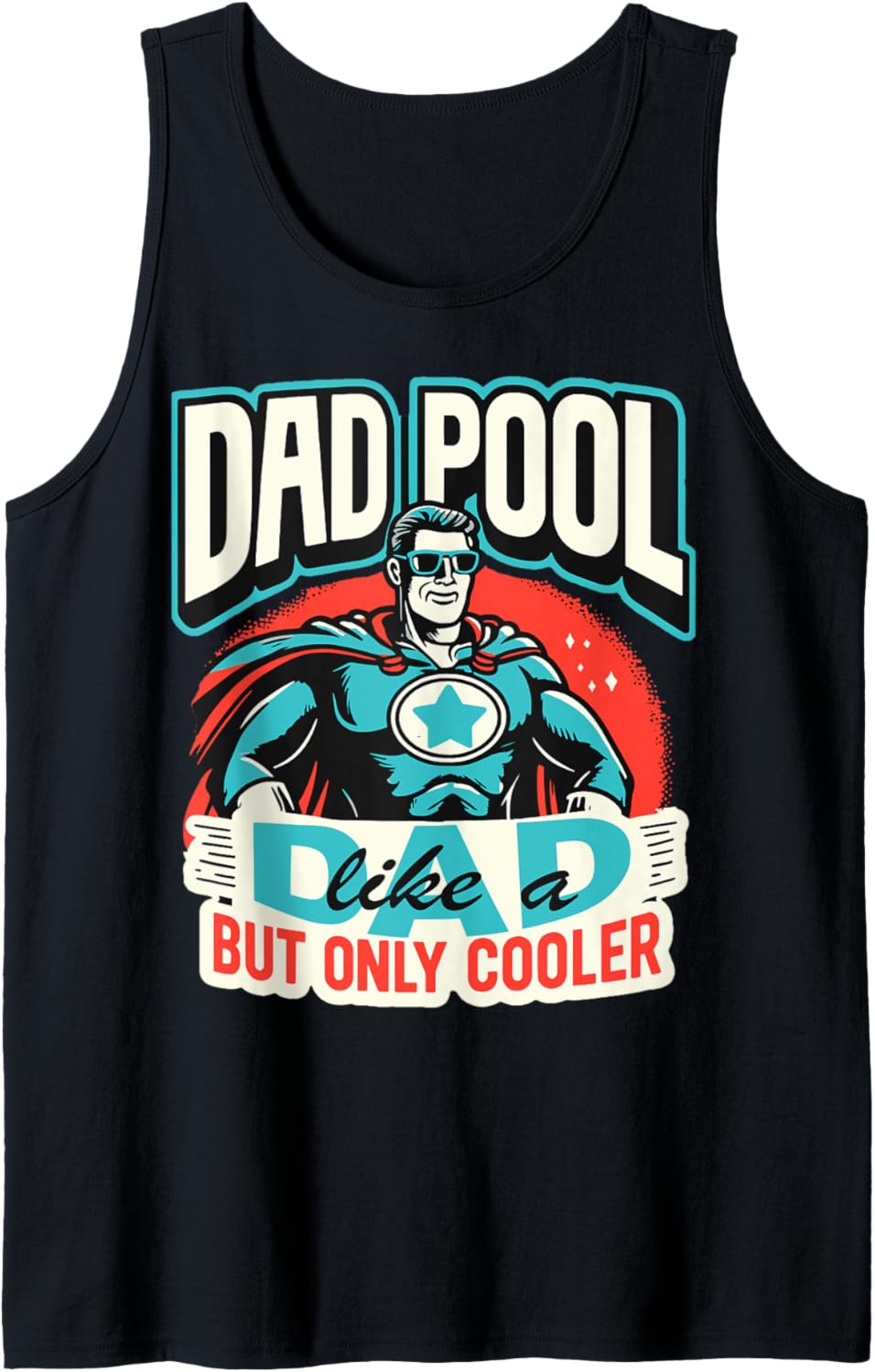 Show off your cooler dad status with this fun and cool design featuring a superhero dad in sunglasses and a cape, along with the text “Dad Pool like a dad but only cooler”.